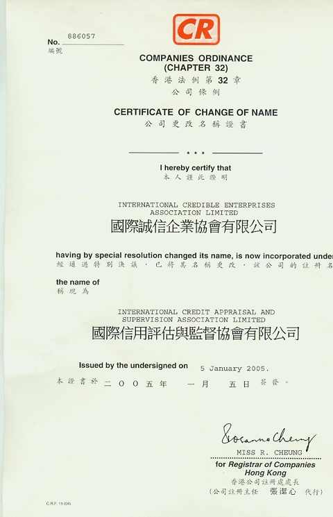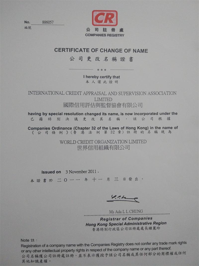 (后更名为世界信用组织有限公司、公司证书无须每年换发):编号:886057